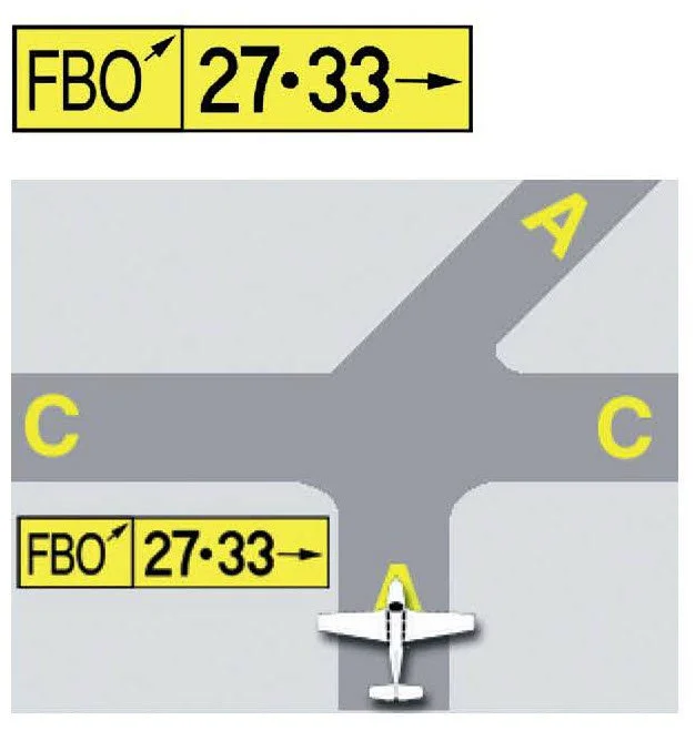 This sign indicates the direction of a taxi route to a runway(s) or other location. In the example above Runways 27 and 33 are to the immediate right.